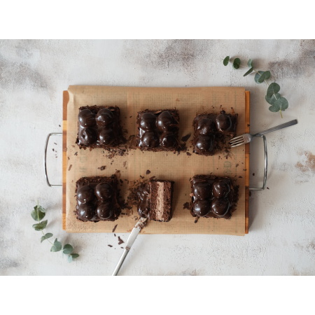 Weizenmehl (Alpha-Amylase, Ascorbinsäure), Weizenstärke, Wasser, Pasteurisiert Ei, Pasteurisiertes Milch, Bitter Schokolade, Zucker, Kakao, Pflanzliche Schlagsahne [Sonnenblumenöl, Molke Pulver, Emulgator (E475)], Margarine [Pflanzenöl (Palm-öl, Sonnenblumenöl, Rapsöl), Emulgator (Mono- und Diglyceride von Fettsäuren, Sonnenblumen Lecithin), Farbstoff (Beta-Carotin)], Backpulver (Natriumbicarbonat), Emulgator [Wasser, Mono Propylenglykol (E1520), Glycerin (E422), Polyglycerinester von Fettsäuren (E475), Diacetylweinsäureester von Mono- und Diglyceriden von pflanzlichen Fettsäuren] Natur Gelee, Glukose Sirup, Gelatine.