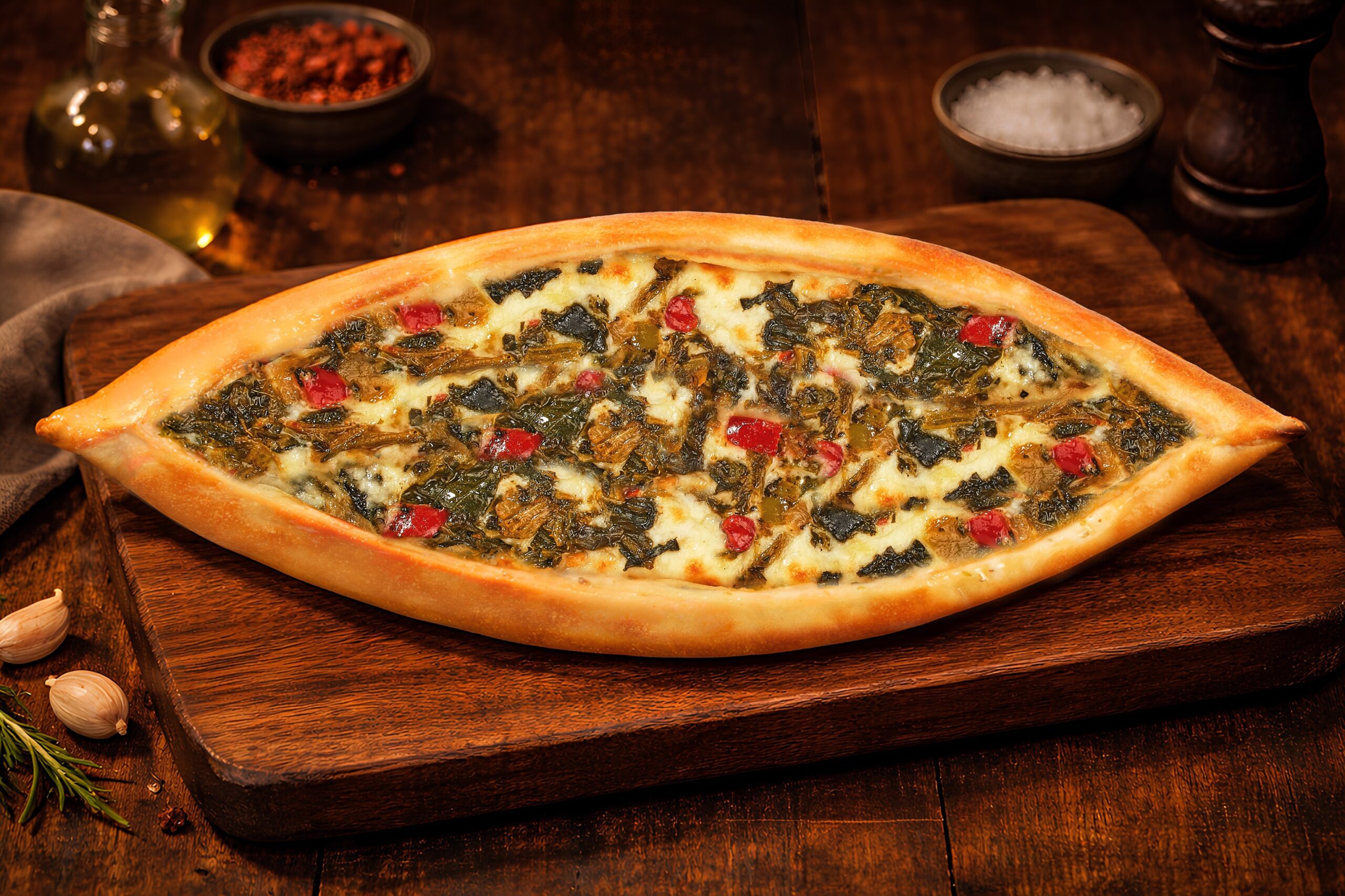 Traditionelles anatolisches Gebäck in Schiffchenform. Die Füllung besteht aus Mozzerella und Spinat. Fertiggebacken, tiefgekühlt