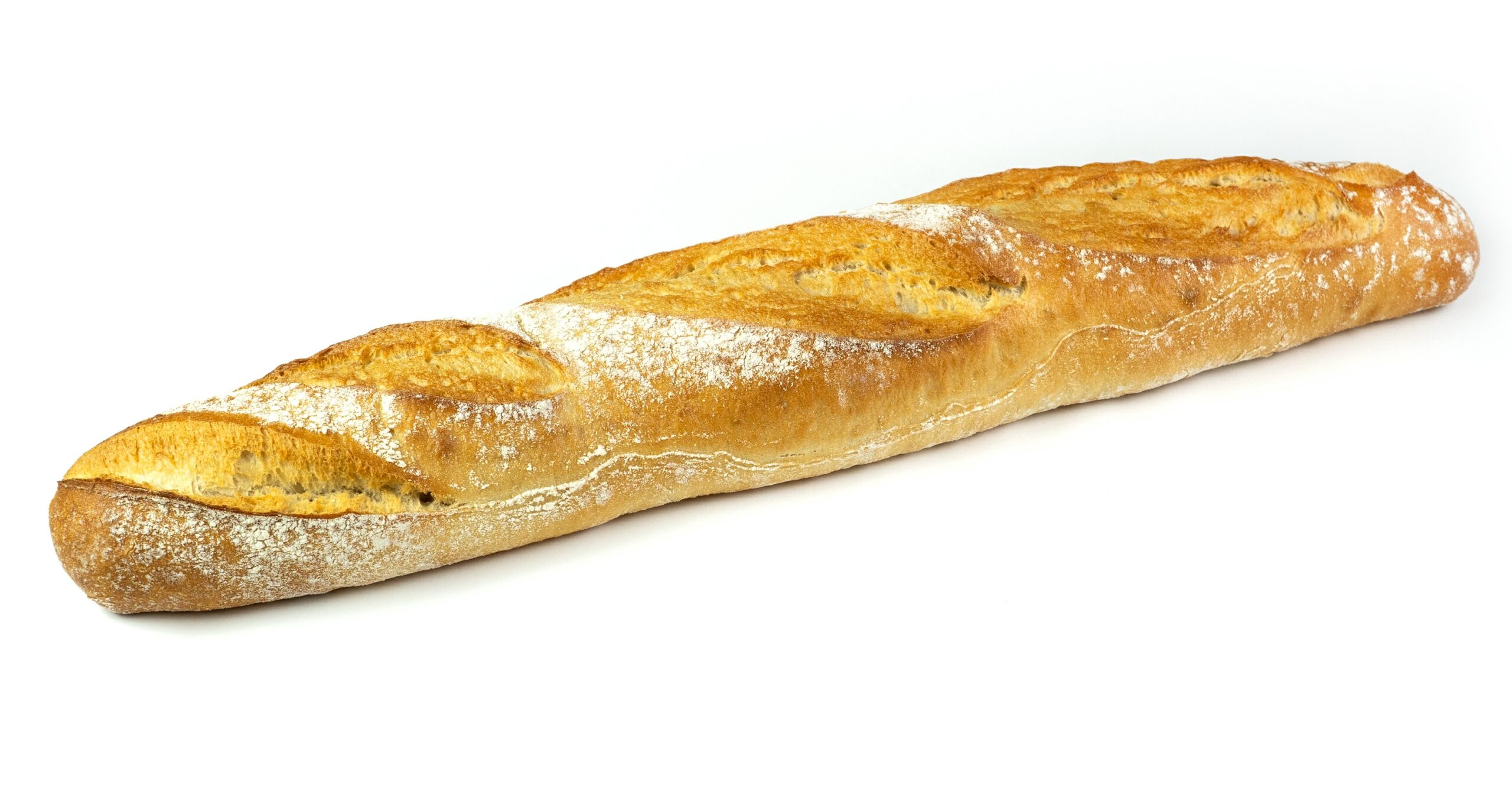 Mediterranes Steinofenbaguette mit drei diagonalen Schnitten und spitz zulaufenden Enden. Die Oberfläche ist rustikal und leicht bemehlt. Das Produkt ist aus Weizenteig und teilgebacken
