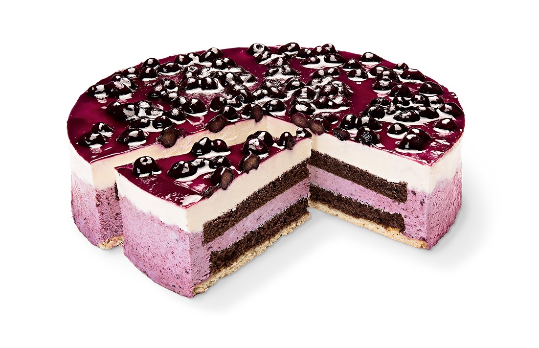 Heidelbeer-Sahnecreme-Füllung (32%) zwischen zwei dunklen Biskuitböden auf einem Mürbeteig, bedeckt mit einer Vanille-Sahne (33%) und Kulturheidelbeeren (7%), abgeglänzt mit einem Pektinguss, tiefgefroren