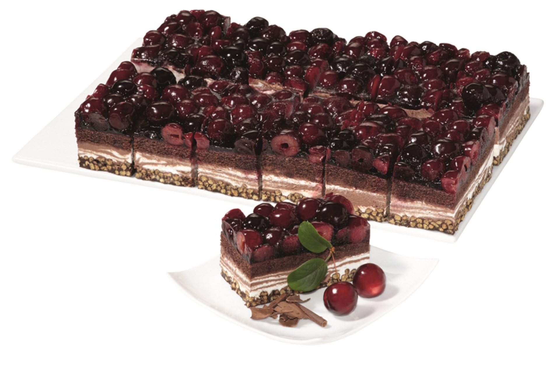 Kakaocreme (14%) und helle Creme (14%) zwischen dunklem Rührteigboden und Boden aus kakaohaltiger Fettglasur und Knusperweizen, mit Süß- und Sauerkirschen belegt und Tortenguss abgeglänzt, tiefgefroren, vorgeschnitten in 12 Portionen.