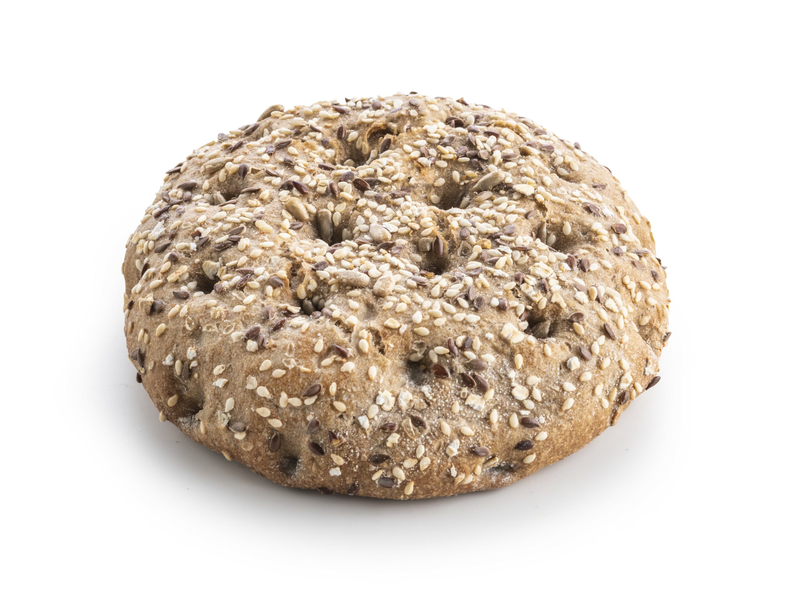 Korn – fossette, tiefgefrorenes, rundes weizenmischbrötchen, mit saaten 9%, fertig gebacken.