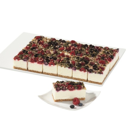Marmorierter Käsekuchen aus dunklem Mürbeteigboden, Käsemasse (71%) und kakaohaltiger Käsemasse (8%), mit Tortenguss abgeglänzt, tiefgefroren, vorgeschnitten in 12 Portionen.